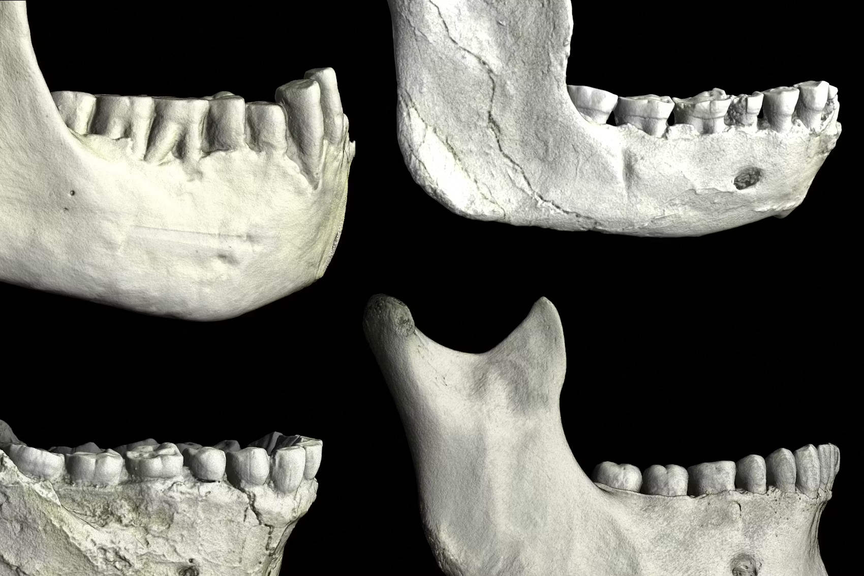 Des mâchoires inférieures provenant d’Afrique du Nord, illustrent les variations entre les hominidés fossiles et les humains modernes, avec un Tighennif 3 d’Algérie (en haut à gauche), un ThI-GH-10717 de la carrière Thomas au Maroc (en haut à droite) et un Jebel Irhoud 11 du Maroc (en bas à gauche), comparés à une mandibule d’un humain moderne récent (en bas à droite). Interview pour en savoir plus sur « The Conversation »
